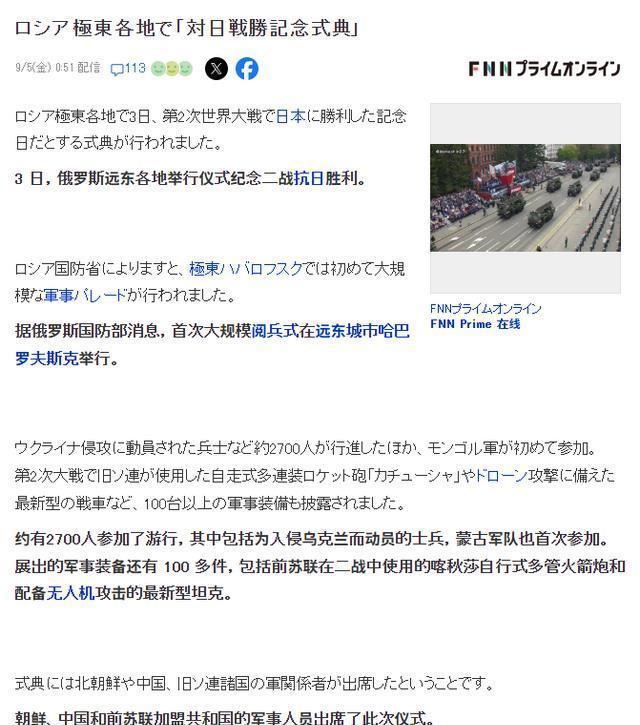 但就算那些被俄军押上车游街示众的不是真正的鬼子战俘,这事在日本人那儿依然引起了强烈的舆论反响。因为俄罗斯人整的这个花活它是一套的,不仅是在哈巴罗夫斯克,他们还于9月3日这天,在俄日争议领土南千岛群岛——也就是日本人所谓的“北方四岛”上,也组织了类似的抗日战争胜利纪念活动。 北方四岛是俄日关系中一个极为重要的结子,日本人对其精神之敏感,比起我们的钓鱼岛来可谓是有过之无不及。因此俄罗斯的这个阅兵式这么一搞,日本人立马就破防了。包括东京电视台和时事通讯社在内的日本主流媒体,均对这一新闻进行了报道,并在报道中使用“不可思议”和“令人不安”等词汇来形容俄罗斯人给他们上眼药的行为,并此举“令日本民众无法接受”。